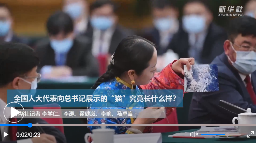 在會(huì)議現(xiàn)場(chǎng),全國(guó)人大代表、青海省海北藏族自治州門源回族自治縣教育局教研室副主任孔慶菊拿出兩張照片,向習(xí)總書記展示了兩種可愛(ài)的“貓”。