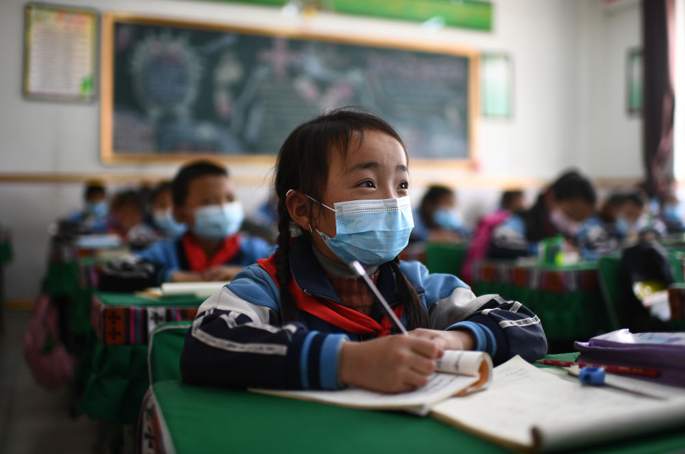 ↑ 在青海省玉樹藏族自治州八一孤兒學(xué)校,學(xué)生們在進(jìn)行課間活動(2020年4月3日攝)。 新華社記者 張龍 攝