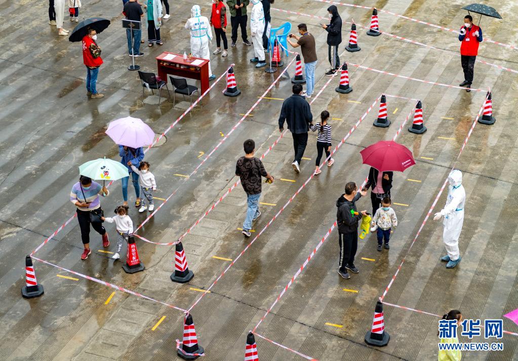 4月6日,在瑞麗市目瑙社區(qū)一核酸檢測點,當(dāng)?shù)鼐用裢ㄟ^設(shè)置的通道排隊采樣。新華社記者 陳欣波 攝