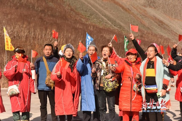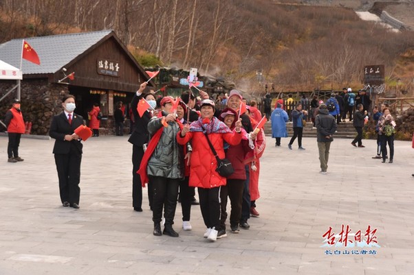 在溫泉廣場(chǎng),幾位游客手持自拍桿,邊跳舞邊拍攝,展現(xiàn)著來(lái)長(zhǎng)白山游玩的快樂心情。記者偶遇到精神飽滿的游客們手持國(guó)旗在廣場(chǎng)上唱響《歌唱祖國(guó)》,悠揚(yáng)的歌聲縈繞在長(zhǎng)白山上空......