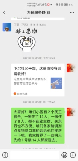 看著手里拎的幾顆白菜、蘿卜、西紅柿,我感到慚愧難當,作為一名黨員、一名下沉干部,實在是失職,沒有履行好“民之所憂,我必念之;民之所盼,我必行之”的使命擔當。投送完愛心菜到家后,我立即在群里倡議小區(qū)下沉干部對1-3-2302的務(wù)工人員開展愛心救助活動,并從自家的抗疫儲備物資里勻出了2袋子蔬菜、豆腐乳、魚醬罐頭、口罩、水果等物資,并附上了溫馨小紙條,寫上我的聯(lián)系電話,鼓勵他們堅定克服困難的信心和決心。第二天,社區(qū)領(lǐng)導、小區(qū)鄰居們得知情況后,紛紛伸出援助之手,不到半小時,鍋灶有了、菜刀案板有了、糧食蔬菜也都有了…,社區(qū)的慰問品也送來了。大伙不僅給他們送去了物資,更送去了關(guān)心和安慰,他們的生活起居也迅速融入了小區(qū)大家庭,業(yè)主群里每天都有人對他們噓寒問暖,他們也經(jīng)常在業(yè)主群曬他們做的川味美食。他們私下跟我說,這幾年,他們在湖北、新疆等地都遇到過疫情,但最讓他們感動的還是西安,黨和政府的細致安排、西安人民的熱情相助,讓他們在他鄉(xiāng)異地孤立無援時,第一次感到不慌了。