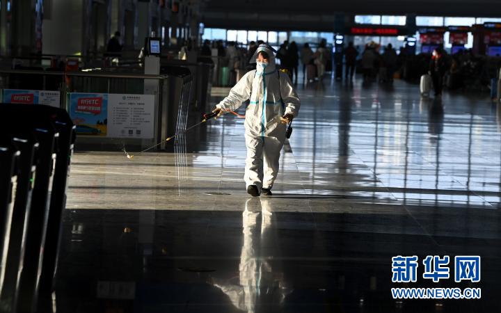 1月16日,工作人員在對西安北站候車大廳進行環(huán)境消毒。新華社記者 陶明 攝