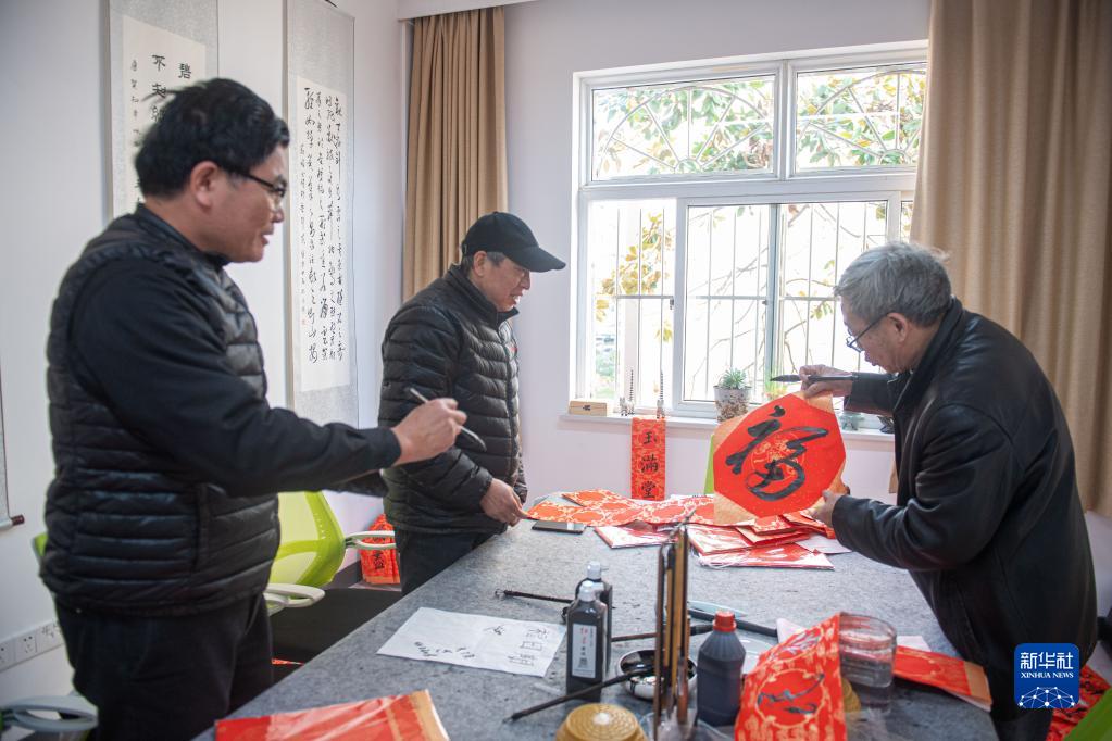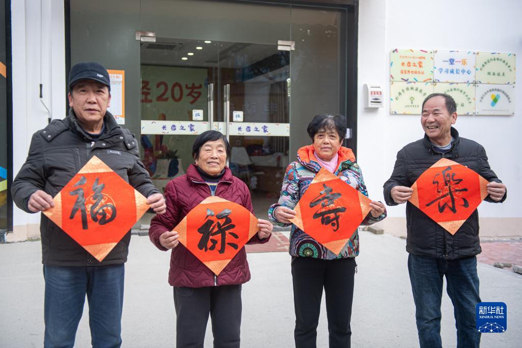 1月18日,江北區(qū)桃源小區(qū)的居民在“長者之家”寫“福”字。該小區(qū)老年人居住比例較高,在老舊小區(qū)改造過程中,街道將小區(qū)內(nèi)閑置用房改造成集老年大學、幼兒托管等為一體的“長者之家”。新華社記者 江漢 攝