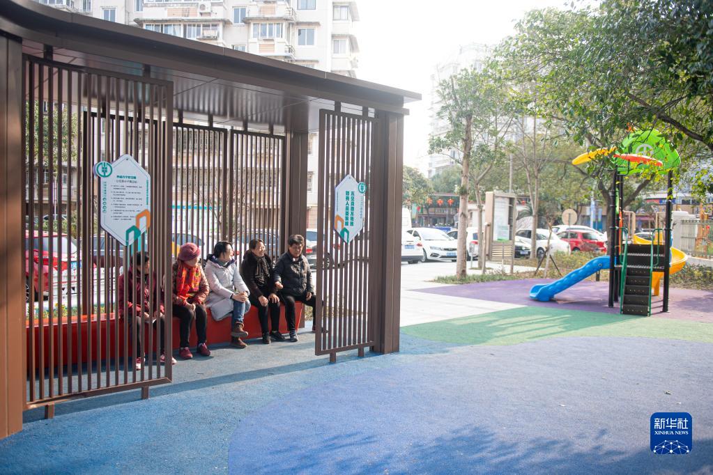 1月18日,江北區(qū)桃源小區(qū)的居民在小區(qū)里聊天。新華社記者 江漢 攝