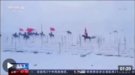 這段視頻拍攝于1月20日,中國國家越野滑雪隊結束在新疆溫泉縣集訓,踏上趕赴北京冬奧會的征途。目睹運動員們刻苦訓練的附近山區(qū)牧民,特意挑選20多匹駿馬自發(fā)組成馬隊,高舉國旗騎馬追趕車隊,并大聲吶喊助威。