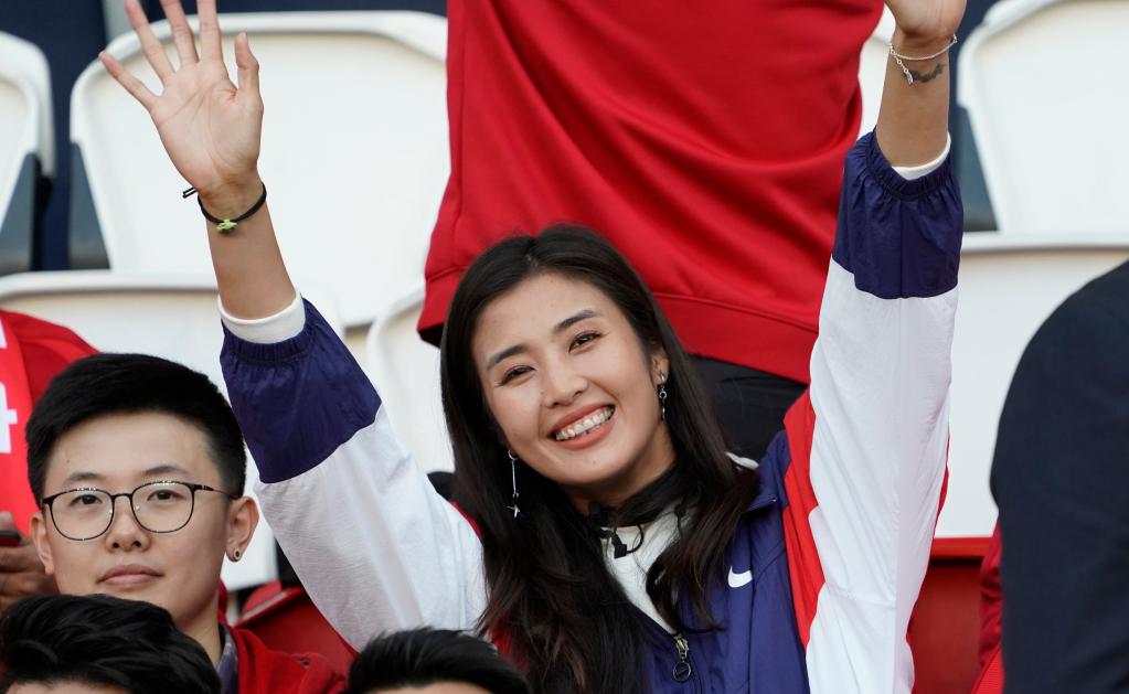 2019年6月13日,中國(guó)女足守門員趙麗娜在看臺(tái)上加油助威。新華社記者丁旭攝