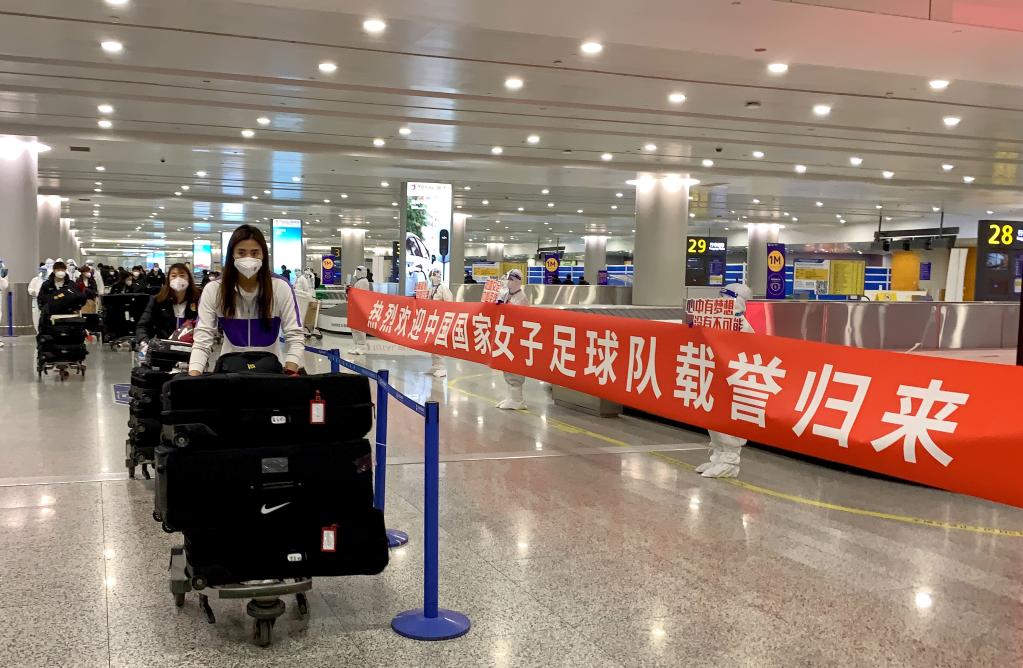 2月7日,中國(guó)女足隊(duì)員抵達(dá)上海浦東國(guó)際機(jī)場(chǎng)。新華社發(fā)(中國(guó)東方航空供圖)