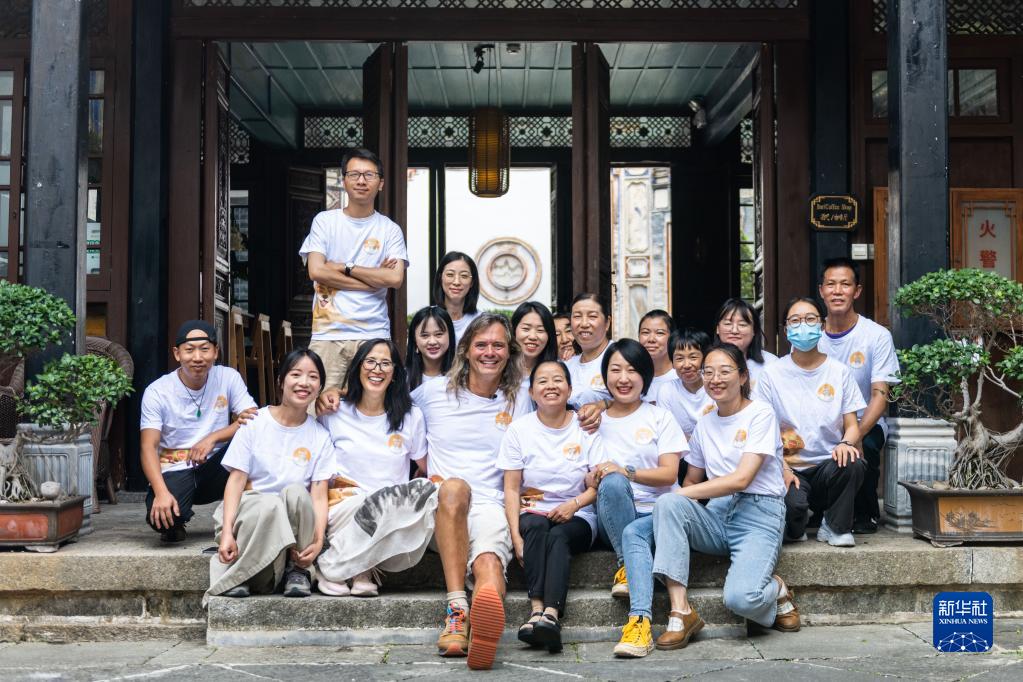 8月28日,林登和妻子瑾妮與喜林苑團(tuán)隊在云南省喜洲古鎮(zhèn)喜林苑合影。新華社記者 曹夢瑤 攝