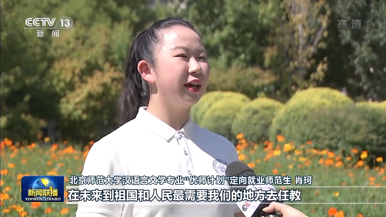 北京師范大學漢語言文學專業(yè)“優(yōu)師計劃”定向就業(yè)師范生 肖珂:總書記勉勵我們增長傳道授業(yè)解惑本領(lǐng),在未來到祖國和人民最需要我們的地方去任教。我定不負囑托,努力學習,在畢業(yè)后回到我的家鄉(xiāng)。