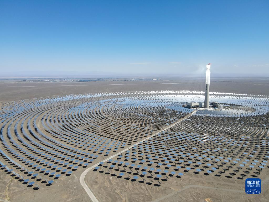 在新疆伊吾縣淖毛湖鎮(zhèn)拍攝的哈密50兆瓦熔鹽塔式光熱發(fā)電站(2021年8月22日攝,無(wú)人機(jī)照片)。作為新疆第一座光熱發(fā)電站,哈密50兆瓦熔鹽塔式光熱發(fā)電站不僅污染物零排放,還通過(guò)儲(chǔ)存熱能實(shí)現(xiàn)24小時(shí)持續(xù)發(fā)電。新華社記者 高晗 攝