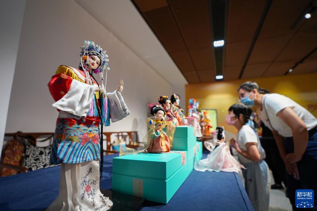 觀眾在中國工藝美術館觀看北京絹人工藝品(2022年9月10日攝)。新華社記者 陳鐘昊 攝