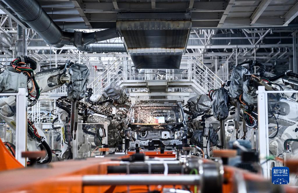 10月17日,在吉林長春中國第一汽車集團(tuán)有限公司紅旗繁榮工廠焊裝車間內(nèi),焊裝機(jī)器人在生產(chǎn)線上焊接車身。新華社記者 顏麟蘊(yùn) 攝