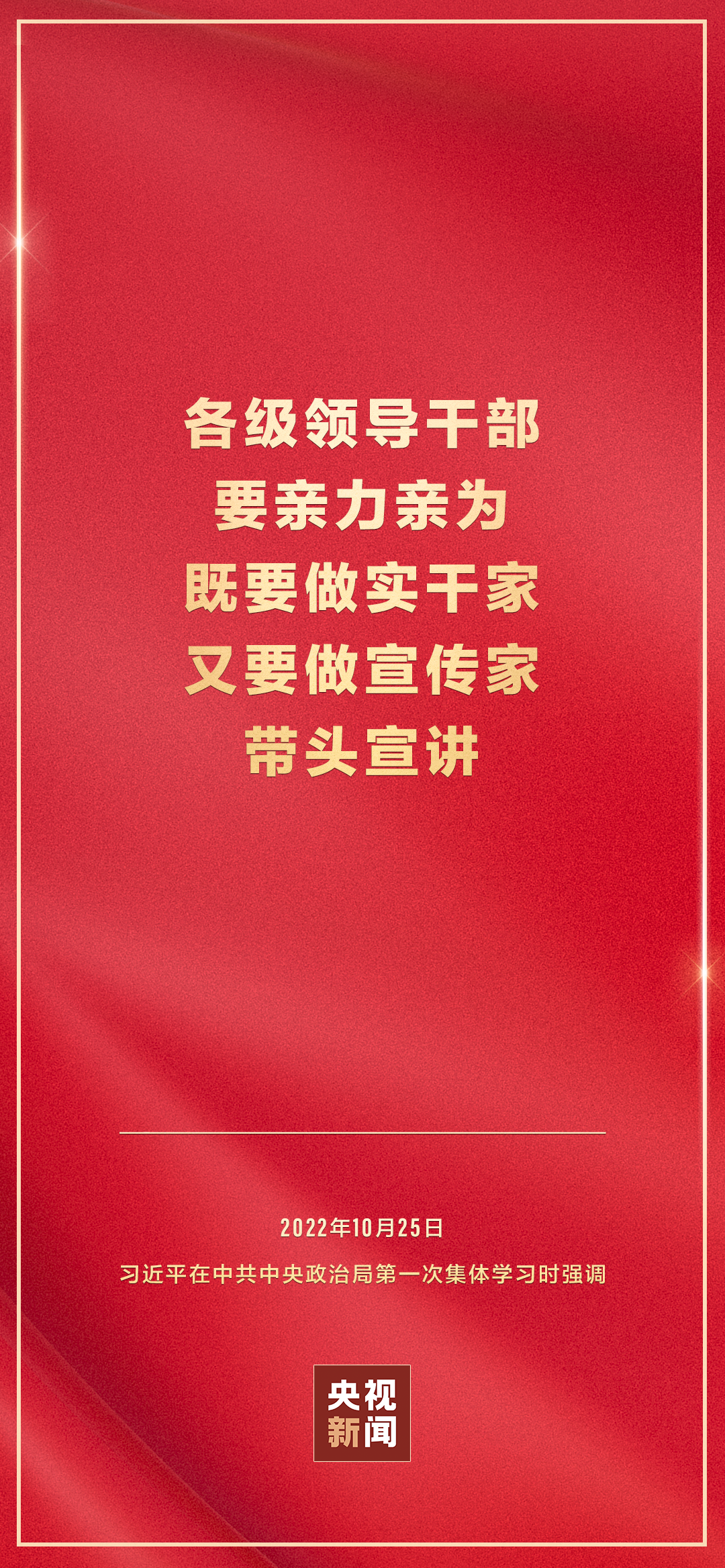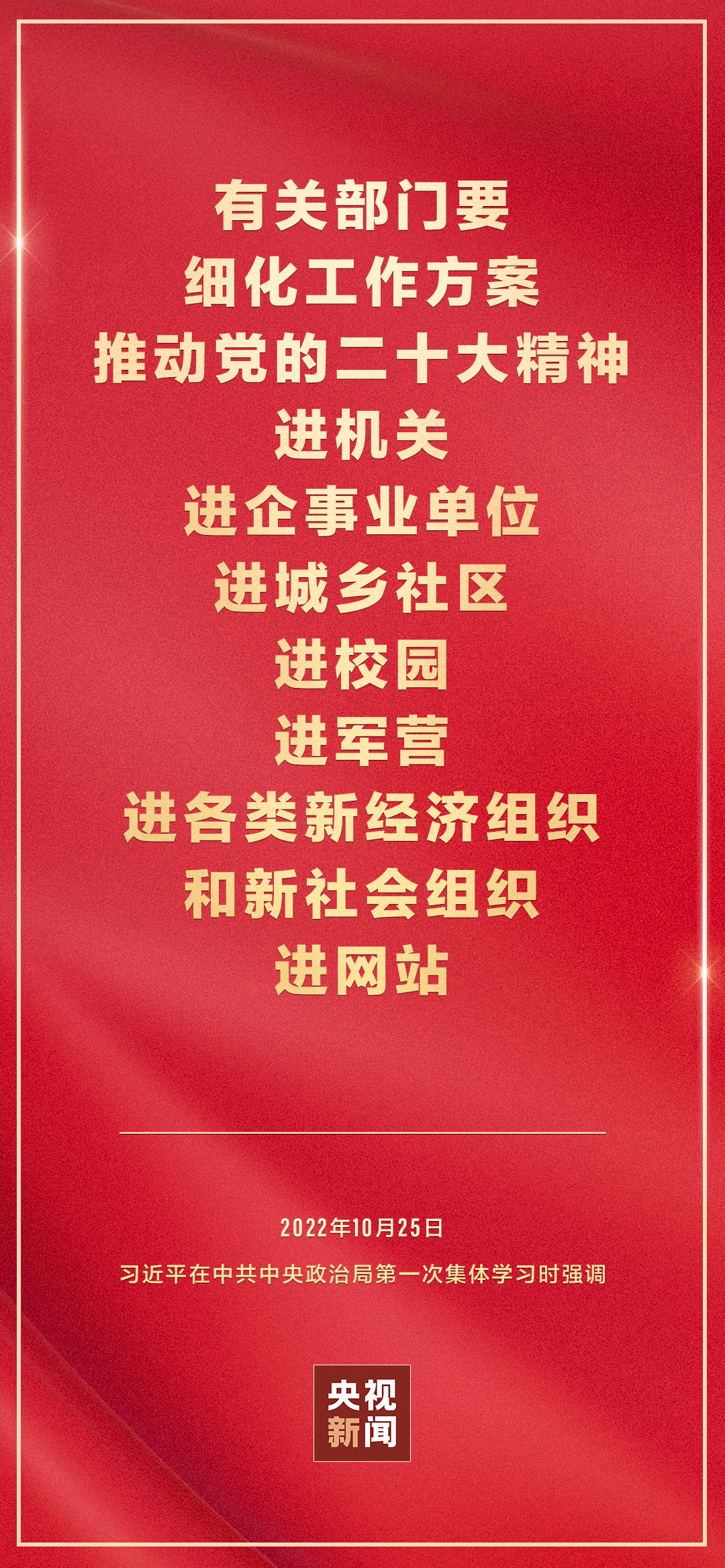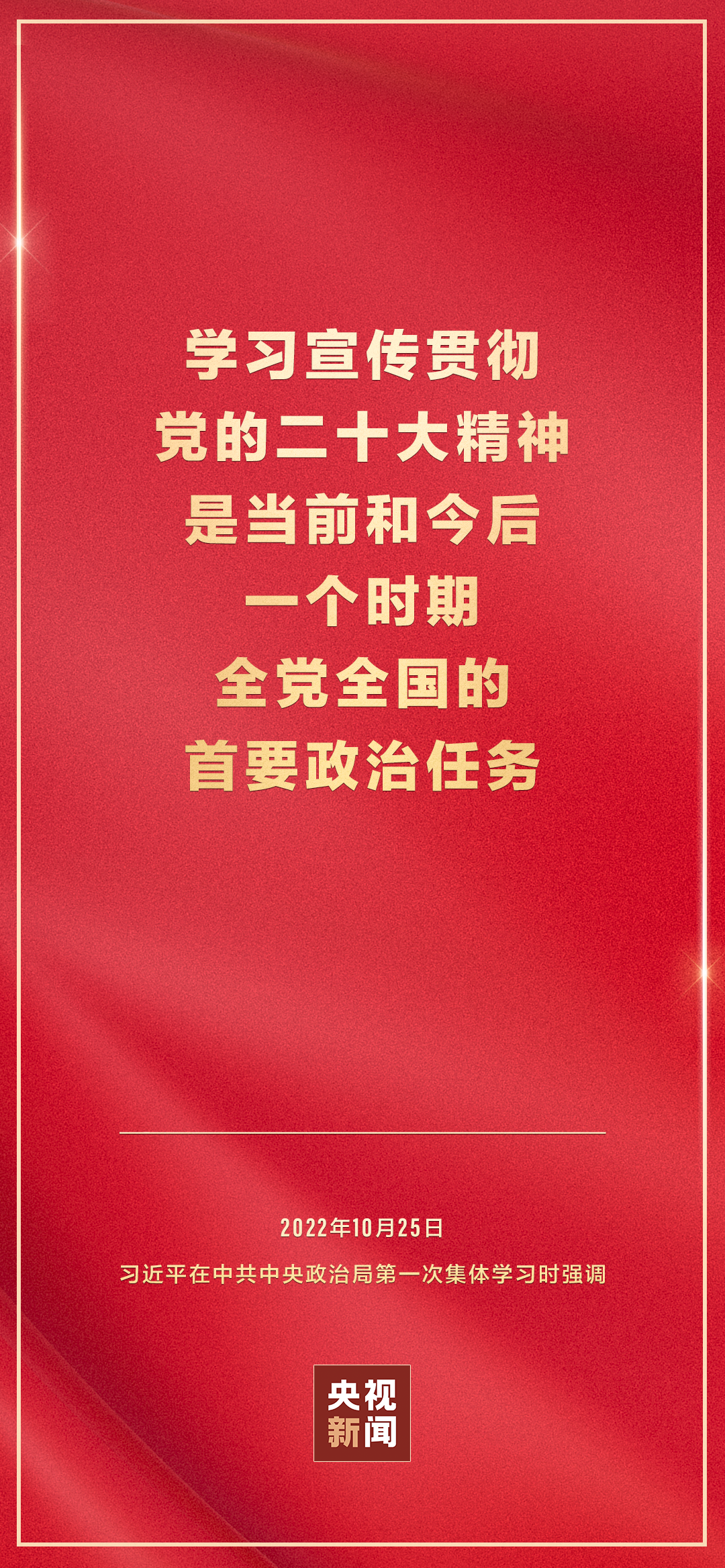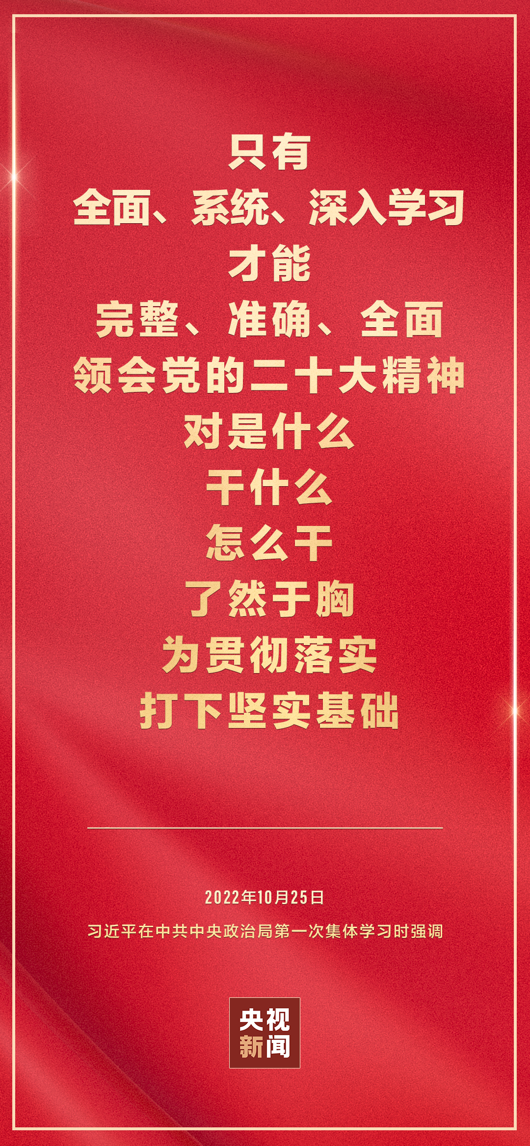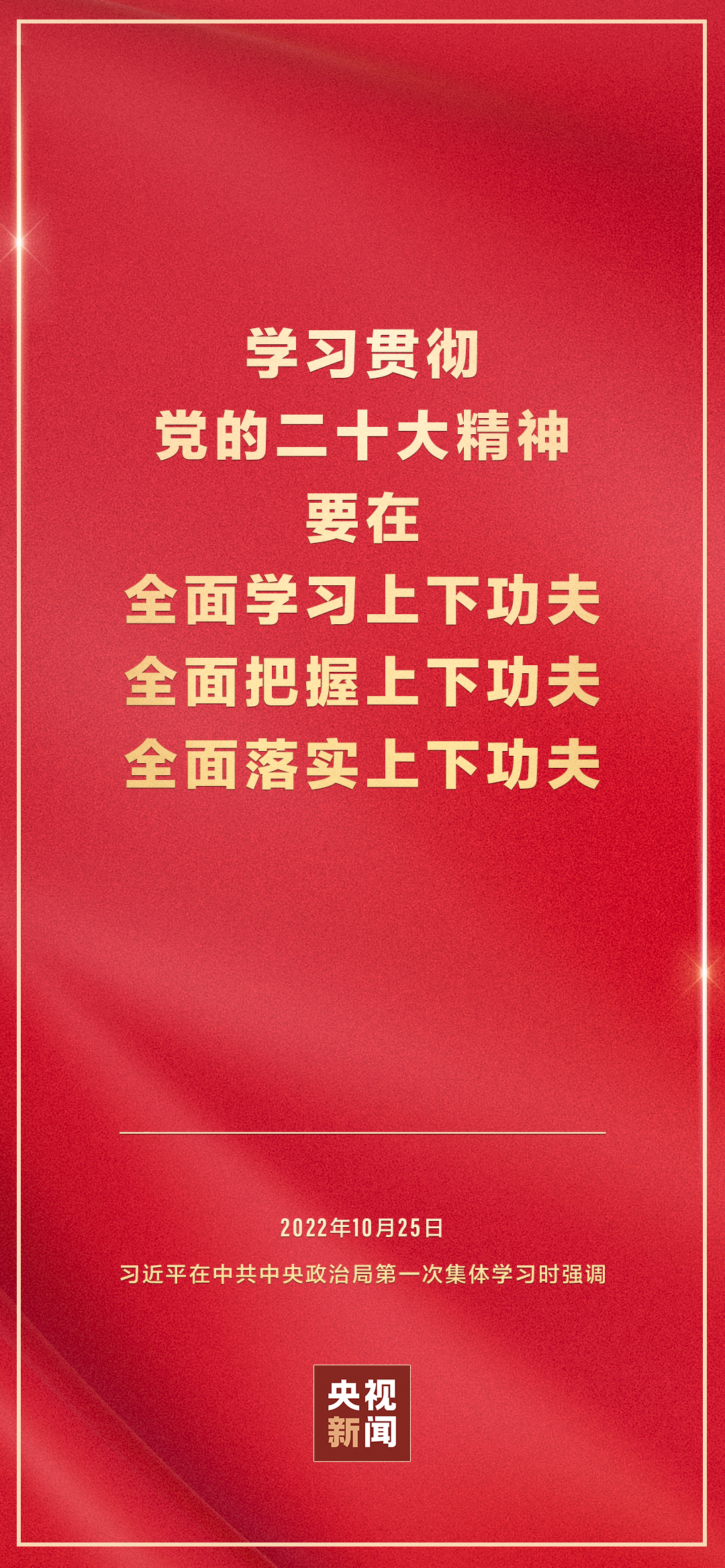 二十屆中共中央政治局10月25日下午就學(xué)習(xí)貫徹黨的二十大精神進(jìn)行第一次集體學(xué)習(xí)。中共中央總書記習(xí)近平在主持學(xué)習(xí)時(shí)強(qiáng)調(diào),全黨要在全面學(xué)習(xí)、全面把握、全面落實(shí)上下功夫,堅(jiān)定不移把黨的二十大提出的目標(biāo)任務(wù)落到實(shí)處,奮力奪取全面建設(shè)社會(huì)主義現(xiàn)代化國家新勝利。
