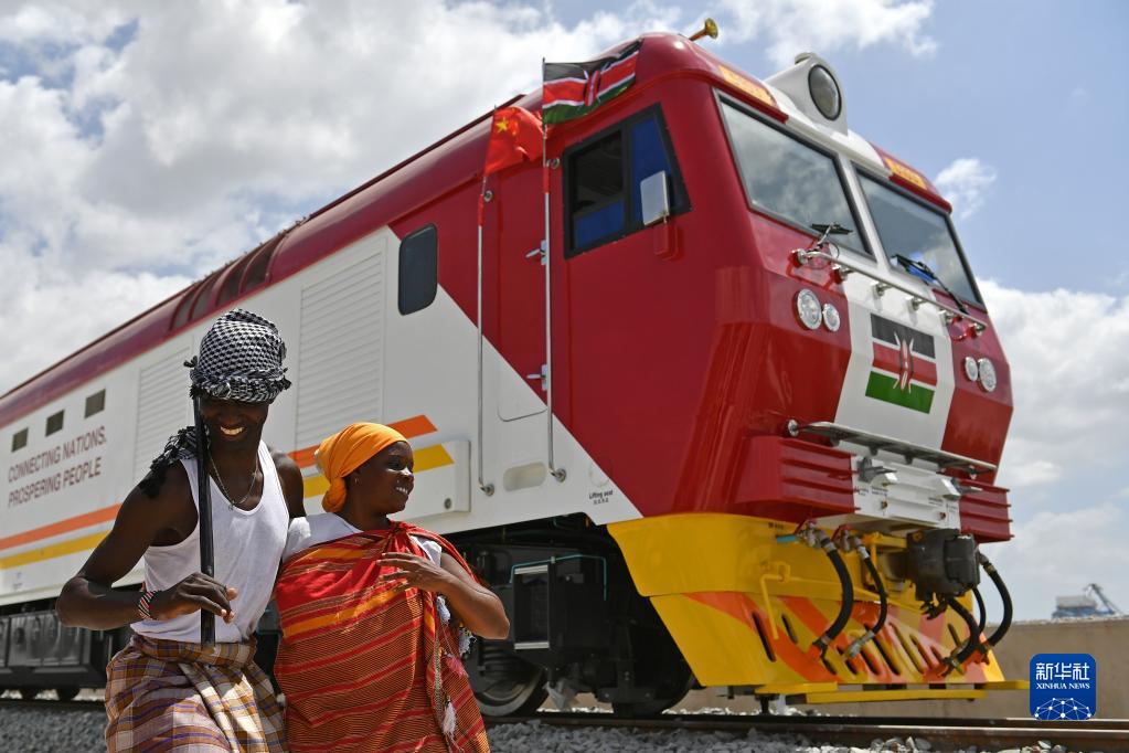 在肯尼亞蒙巴薩,當(dāng)?shù)孛癖娫谥袊?guó)承制的蒙內(nèi)鐵路首批內(nèi)燃機(jī)車旁載歌載舞(2017年1月11日攝)。新華社記者 孫瑞博 攝