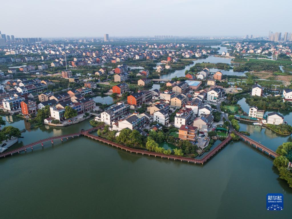 空中俯瞰杭州市余杭區(qū)塘棲古鎮(zhèn)丁山湖邊的水上棧道和丁河村(2019年8月7日攝,無人機(jī)照片)。新華社記者 徐昱 攝
