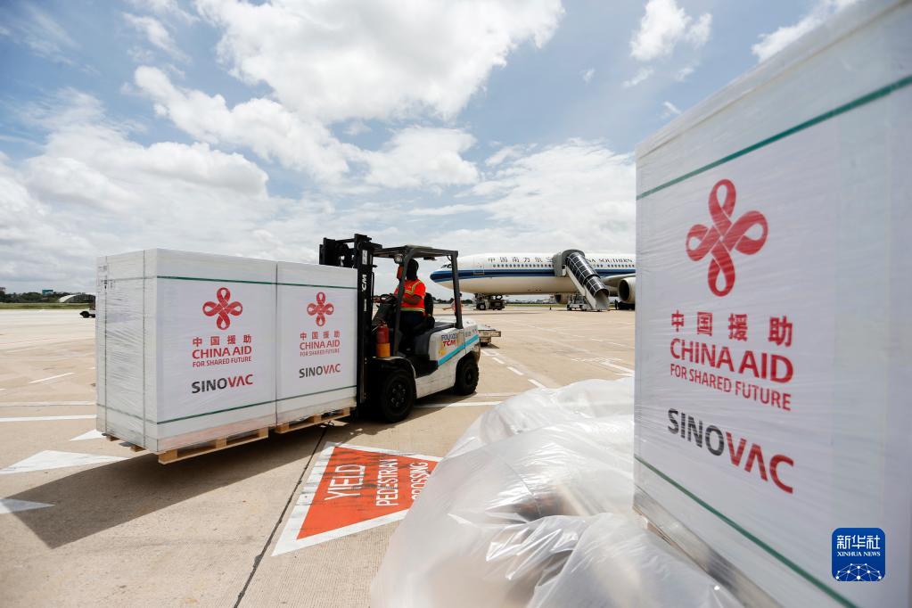 工作人員在柬埔寨金邊國(guó)際機(jī)場(chǎng)運(yùn)輸中國(guó)政府援助柬埔寨的科興新冠疫苗(2021年10月14日攝)。新華社發(fā)(批隆 攝)