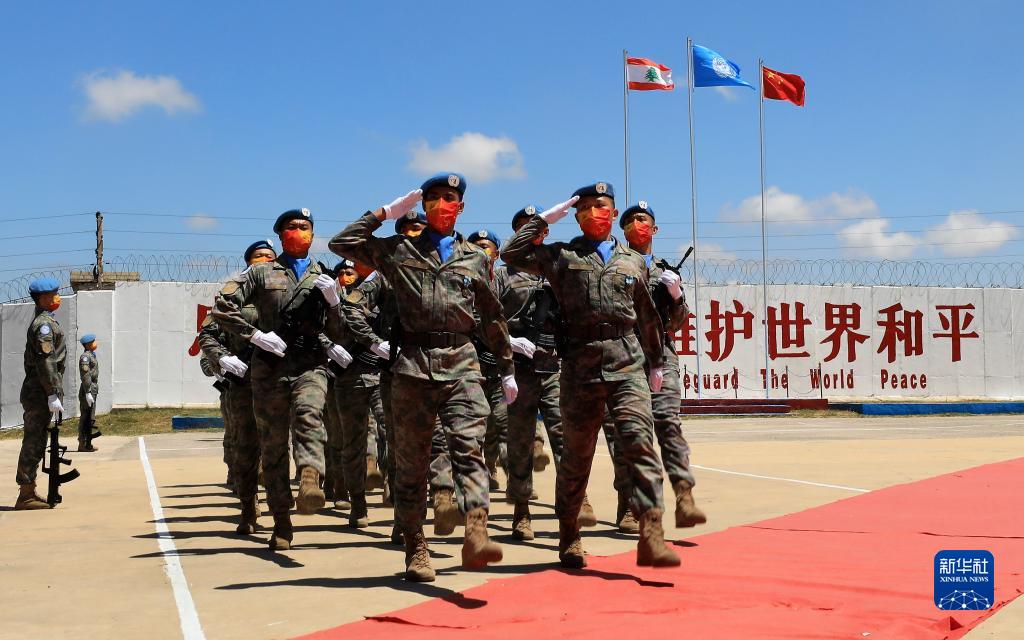 在黎巴嫩南部辛尼亞村的中國(guó)維和部隊(duì)營(yíng)區(qū),中國(guó)維和部隊(duì)官兵在受勛后通過觀禮臺(tái)(2022年7月1日攝)。新華社記者 劉宗亞 攝