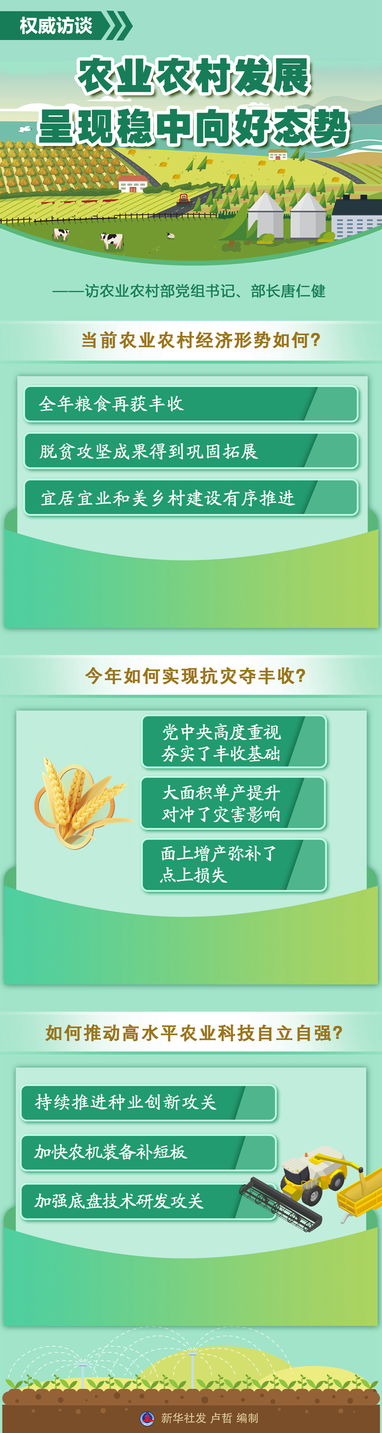 答:習(xí)近平總書記指出,“穩(wěn)住農(nóng)業(yè)基本盤、守好‘三農(nóng)’基礎(chǔ)是應(yīng)變局、開新局的‘壓艙石’”“推進(jìn)農(nóng)業(yè)現(xiàn)代化是實(shí)現(xiàn)高質(zhì)量發(fā)展的必然要求”。今年以來,農(nóng)業(yè)農(nóng)村部認(rèn)真貫徹落實(shí)黨中央、國(guó)務(wù)院決策部署,全力抓好以鄉(xiāng)村振興為重心的“三農(nóng)”各項(xiàng)工作,農(nóng)業(yè)農(nóng)村發(fā)展呈現(xiàn)穩(wěn)中向好態(tài)勢(shì):