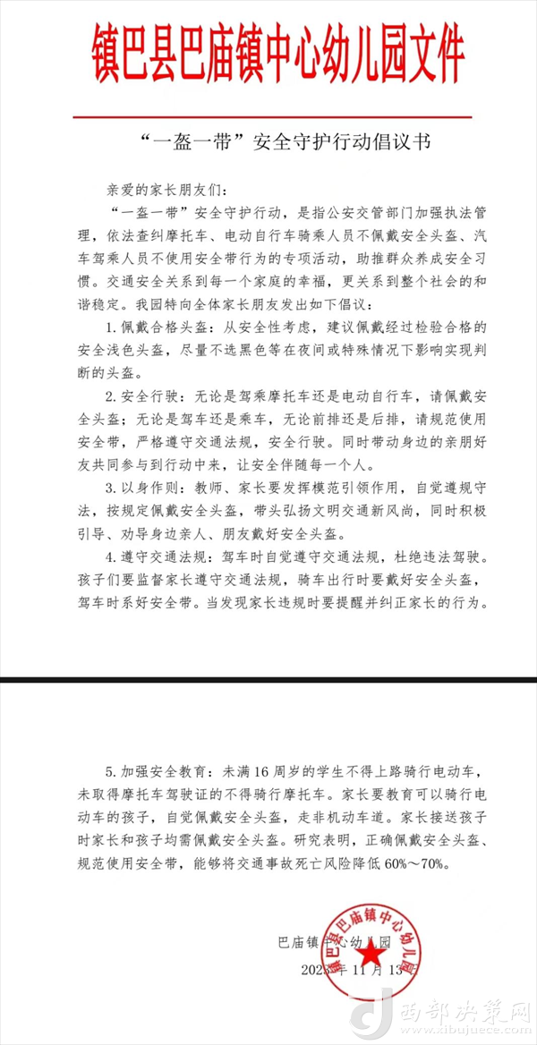 西部決策網(wǎng)訊 近日,漢中市在持續(xù)開展“一帶一盔”安全守護(hù)行動(dòng)。針對(duì)當(dāng)前騎車接送幼兒的家長(zhǎng)很少佩戴頭盔的現(xiàn)象,鎮(zhèn)巴縣巴廟鎮(zhèn)中心幼兒園11月15日開展了“一帶一盔”安全守護(hù)行動(dòng)。